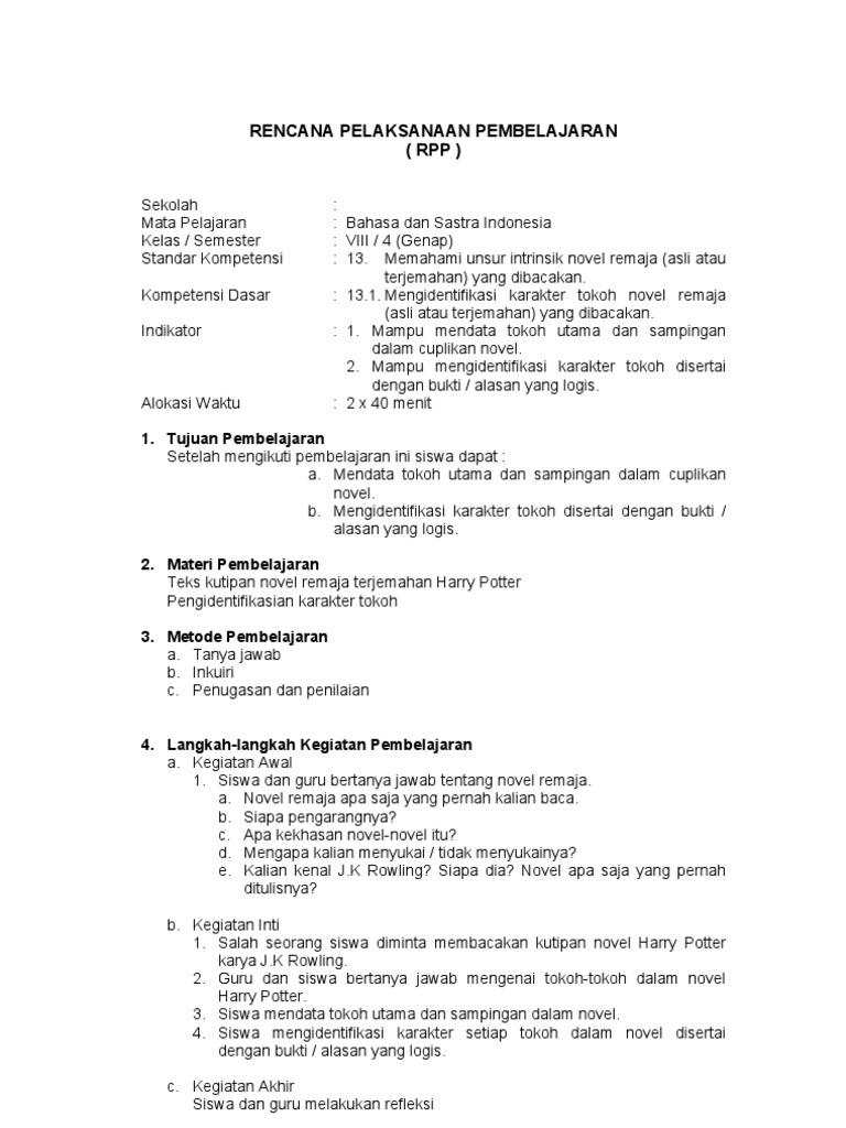 Rpp Bahasa Indonesia Tentang Novel