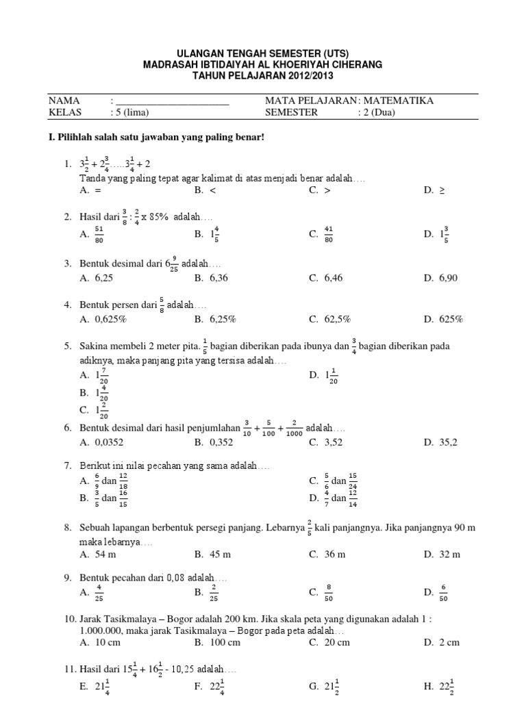 Soal Uts Matematika Kelas 5 Semester 2