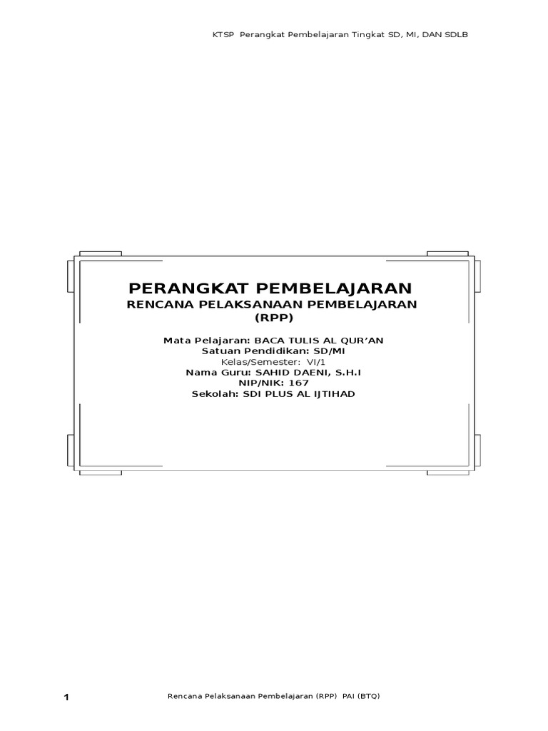 Perangkat Pembelajaran VIDEO RPP 1 HALAMAN 1. Download gratis lengakap contoh file-file perangkat pembelajaran untuk guru BTQ kelas 6 SDMI yang harus dimiliki dalam mempersipakan diri untuk KBM bagi guru yang mengampu pelajaran baca. Contoh Pembelajaran BTQ SD Kelas 3.